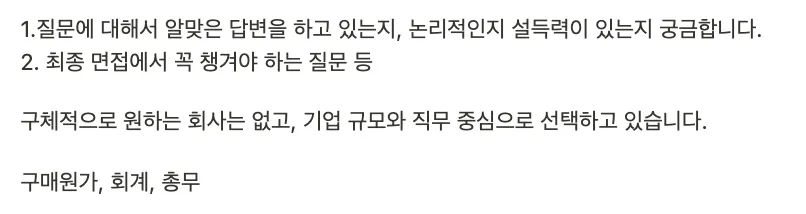 지원자는 질문의도를 파악했는지 표정, 말투 같은 부분을 점검받고 싶어했음. 항상 지적받은 게 간혹가다가 무의식적으로 단답으로 대답하는 경우가 있었다고 함.